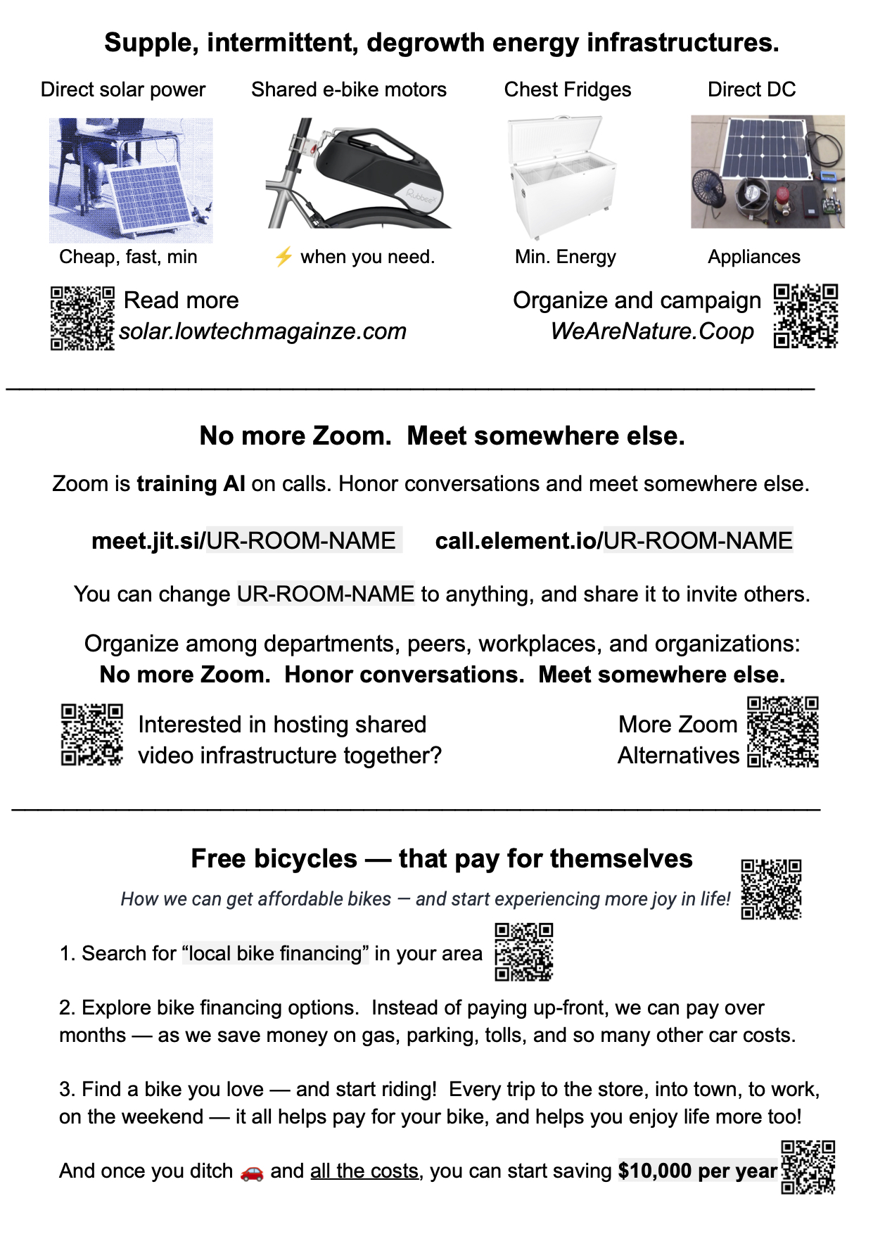 Is that work you want to be part of? Flyering. Workshops. Developing convivial tools. Teaching. Building. Softening. Making change together?